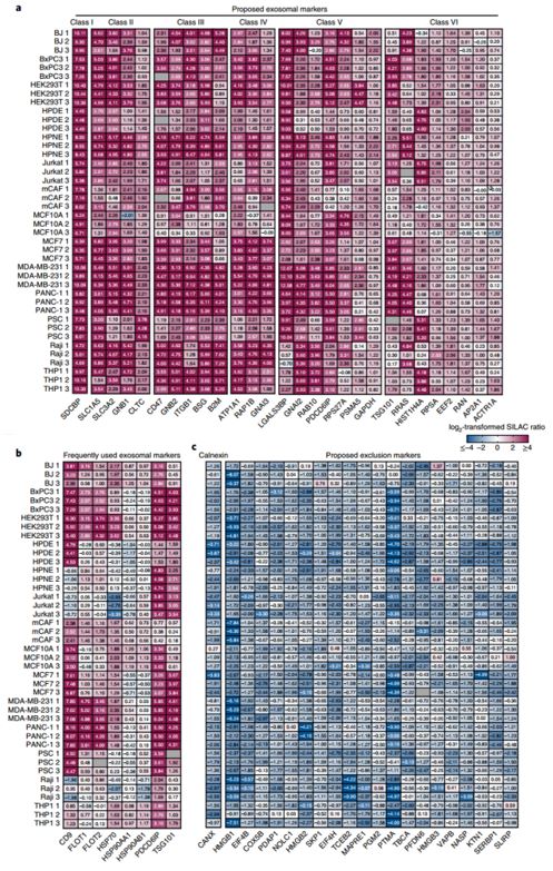 我們經常使用的外泌體生物標志物(CD9、CD63和CD81)是異質性的,在不同細胞類型中沒有表現(xiàn)出普遍高豐度存在。為了發(fā)現(xiàn)外泌體中無處不在和豐富的蛋白質,外泌體領域大牛、MD安德森癌癥中心Raghu Kalluri教授研究團隊使用了一種基于超穩(wěn)定同位素標記細胞培養(yǎng)中的氨基酸(super-SILAC)的無偏和定量蛋白質組學方法,并結合了高分辨率質譜法,共定量了1212種蛋白質,其中外泌體中普遍富集22種蛋白質、缺乏15種蛋白質。并且發(fā)現(xiàn)Syntenin-1蛋白普遍存在于不同方法分離的不同細胞/不同物種和生物流體的外泌體中,可作為外泌體的通用生物標志物。(RaghuKalluri教授發(fā)表過多篇外泌體相關的CNS及子刊文章,文章列表見文末)