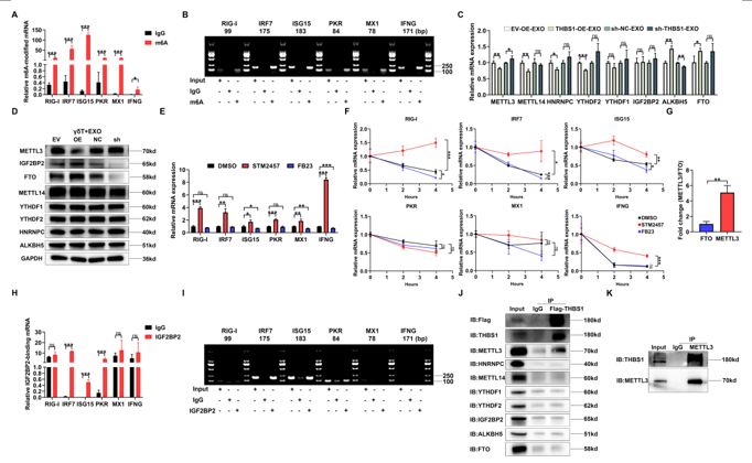 同時(shí),該研究還發(fā)現(xiàn)外泌體THBS1通過(guò)m6A甲基化依賴的方式調(diào)控RIG-I樣受體信號(hào)通路。THBS1能夠與甲基轉(zhuǎn)移酶METTL3發(fā)生蛋白相互作用,減少m6A甲基化修飾,并最終激活RIG-I樣受體信號(hào)通路。