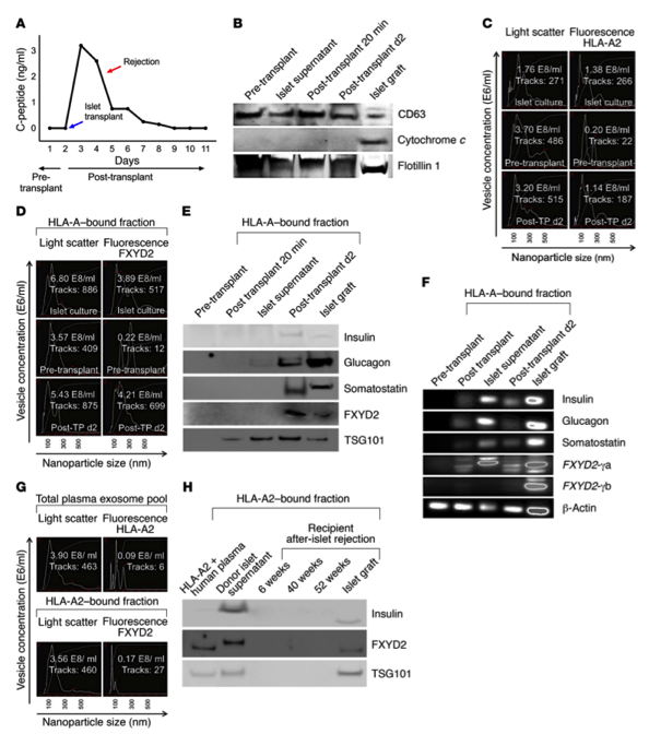 上面的臨床相關(guān)性做完后,接著,研究人員檢測了TISE成分是否可以在臨床樣本中純化并檢測?該患者由于在移植期的加速急性排斥反應(yīng)而導(dǎo)致β細(xì)胞功能喪失(圖7A)。首先,確認(rèn)所有測試的血漿樣品富含外泌體(圖7B)。接下來,使用供體特異性HLA-A2抗體,證實(shí)移植后移植胰島外泌體可檢測到,但在移植前檢測不到(圖7C)。移植胰島外泌體對FXYD2的共表達(dá)是高度陽性的(圖7D),并顯示了在移植后第2天血漿樣品中胰島素、胰高血糖素、生長抑素和FXYD2蛋白的表達(dá)(圖7E),與患者中高血糖癥的校正相關(guān)(圖7A)。RNA成分分析顯示胰島素、胰高血糖素、生長抑素和FXYD2的表達(dá),其在移植前樣品中是不可檢測的(圖7F)。供體外泌體的血漿分析顯示在產(chǎn)生免疫排斥反應(yīng)后HLA-A2信號是陰性的(圖7G),并且也在Western印跡上驗(yàn)證(圖7H)。