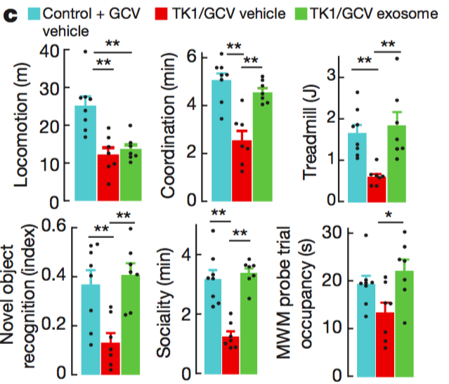 圖3:經(jīng)htNSCs外泌體治療后,小鼠出現(xiàn)的衰老癥狀得到了極大緩解(綠色柱)
