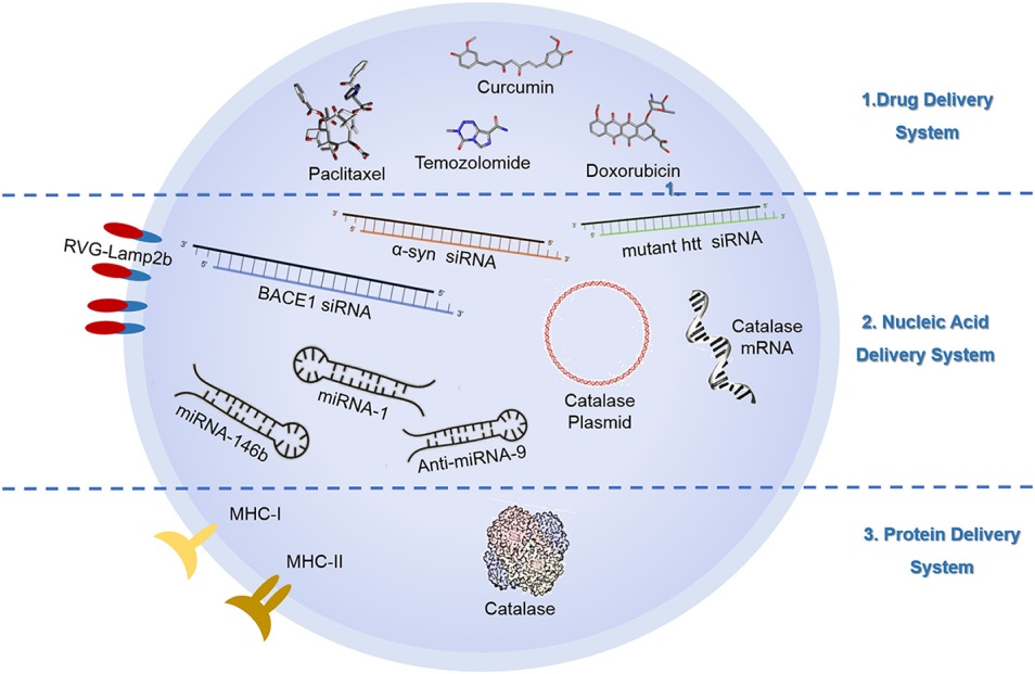 圖4. EVs作為藥物載體示意圖。 1) EVs作為藥物遞送系統(tǒng)攜帶:姜黃素(curcumin,抗炎藥物)、紫杉醇(paclitaxel)、替莫唑胺(temozolomide, TMZ)、阿霉素(doxorubicin,抗癌藥物);2) EVs作為核酸遞送系統(tǒng)攜帶:阿爾茲海默癥中β-secretase 1 (BACE1)的siRNA、帕金森氏癥中α-synuclein (α-syn)的siRNA和亨廷頓氏癥中突變亨廷頓蛋白Huntingtin (mutant htt)的siRNA、腦腫瘤中特異的miRNAs,如miR-146b, miR-1, anti-miR-9、PD中過氧化氫酶mRNA和質(zhì)粒、表面糖蛋白, 如狂犬病病毒糖蛋白(RVG)相關(guān)的溶酶體相關(guān)膜蛋白2 (RVG-Lamp2b)等;3) EVs作為蛋白遞送系統(tǒng)攜帶:主要組織相容性復(fù)合物class I (MHC-I)和class II (MHC-II)、PD中的催化蛋白。