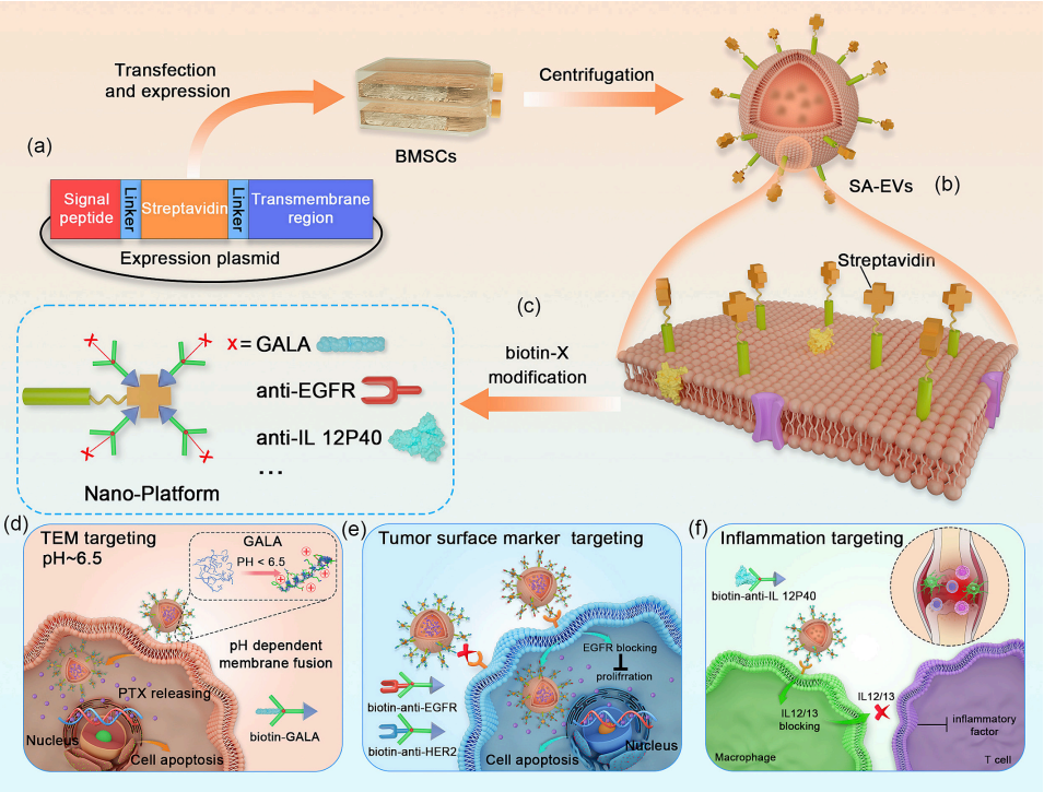 細(xì)胞外囊泡(EV)因其理想的尺寸范圍和內(nèi)在生物相容性而成為有前景的治療載體。然而,有限的靶向能力使EV的臨床轉(zhuǎn)化受阻。任何藥物載體的臨床轉(zhuǎn)化,不僅需要自身的結(jié)構(gòu)優(yōu)勢(shì)和低免疫原性,更重要的是需要其多場(chǎng)景使用的能力。鏈霉親和素和生物素系統(tǒng)是一對(duì)強(qiáng)親和力的分子,它們已廣泛用于體外和體內(nèi)的檢測(cè)、標(biāo)記等領(lǐng)域。但是鏈霉親和素和生物素系統(tǒng)是否能用于提高EV作為藥物載體的靶向性有待探究。因此有必要開(kāi)發(fā)具有多功能的EV靶向平臺(tái)加速EV的臨床轉(zhuǎn)化研究。
