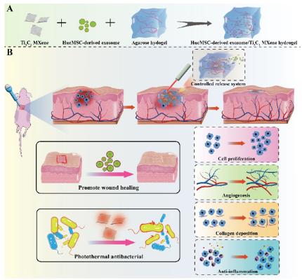 在這項研究中,研究者首次構建了一種新型的基于光熱控釋作用的外泌體多功能水凝膠,所制備的水凝膠具有良好的注射性、生物相容性和光熱抗菌性能。體外和體內實驗表明外泌體/碳化鈦水凝膠可以通過促進傷口中的細胞增殖、血管生成、膠原沉積以及抑制傷口的細菌感染和炎癥來加速皮膚損傷修復并減輕瘢痕形成,展示出優(yōu)異的促進皮膚損傷愈合的潛力。不僅如此,外泌體/碳化鈦水凝膠能夠保持外泌體的固有結構和活性,可實現(xiàn)外泌體的按需遞送。該研究成果有望為設計新型載外泌體多功能水凝膠提供理論基礎,并可進一步拓展基于光熱控釋作用的外泌體水凝膠在其它領域(例如癌癥治療和軟組織修復等)的研究前景。