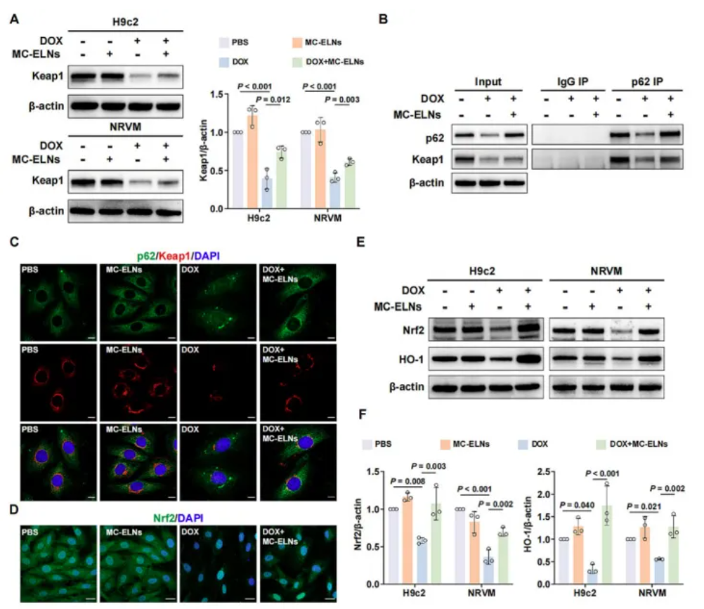在該研究中,研究人員發(fā)現(xiàn)從苦瓜(Momordica charantia L)中獲取的苦瓜外泌體樣納米囊泡(MC-ELNs)具有優(yōu)異的抗氧化性能。MC-ELNs 通過抑制 DOX 誘導(dǎo)的 p62 泛素化降解,穩(wěn)定 p62 蛋白水平,進(jìn)而恢復(fù) p62 與 Keap1 結(jié)合,促進(jìn) Nrf2 核易位和下游基因 HO-1 的表達(dá),促進(jìn)了心肌細(xì)胞的存活。穩(wěn)定 p62 蛋白水平促進(jìn) Nrf2 核易位有望作為減輕癌癥患者 DOX 心臟毒性的治療新靶點(diǎn)。